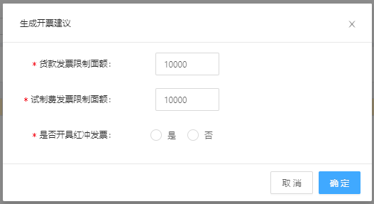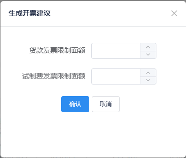 点击生成开票建议后,需要录入货款发票的面额限制和试制费发票面额限制,这样系统才可以模拟开票的内容。