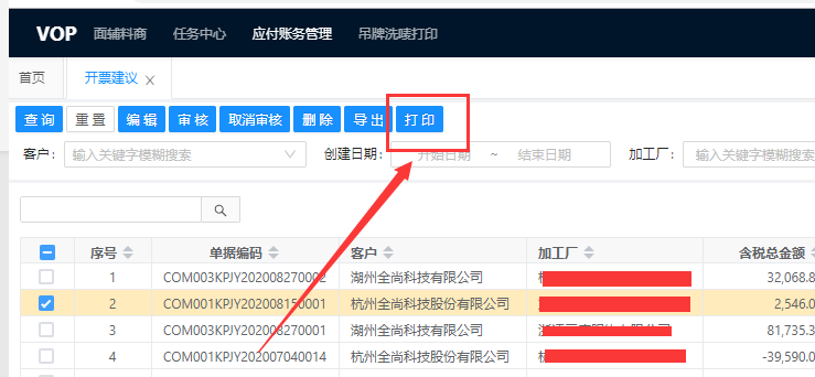 勾选需要打印的开票建议,一次只能勾选一条,不支持批量打印。