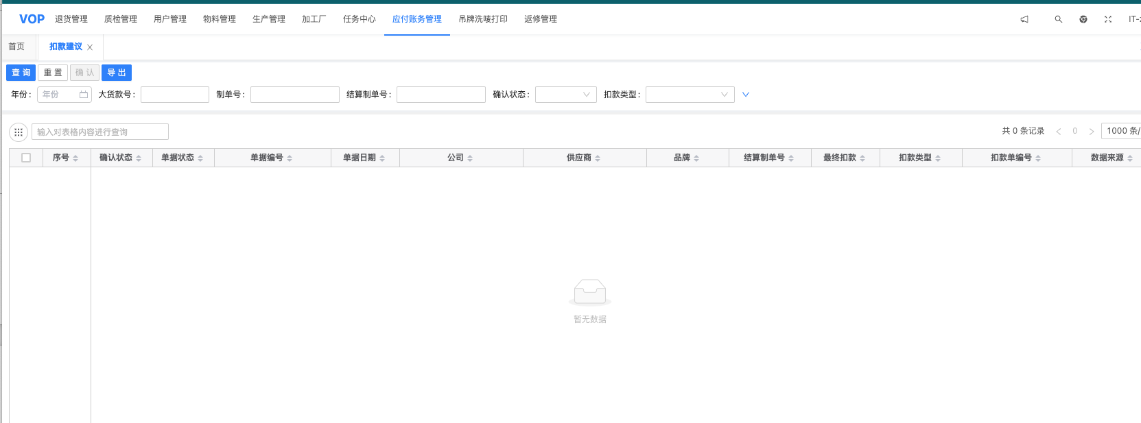 扣款建议分为大货延期扣款、排照样延期、取消扣款、其他原因、质量原因以及大货延期扣款减免6种类型。扣款建议是生成扣款单的依据。