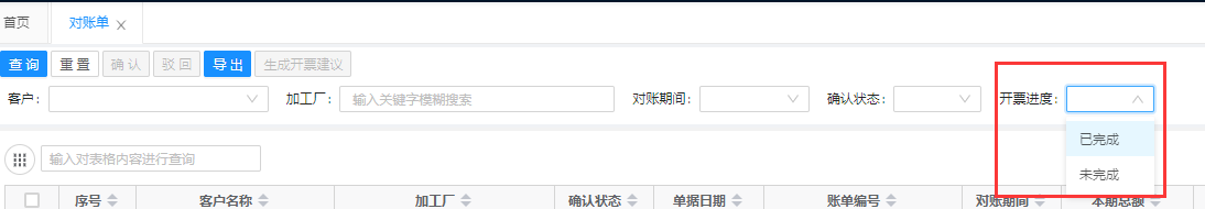用户可以根据“开票进度”查询条件,来查询哪些对账单已经开完票,哪些对账单还未开完票。