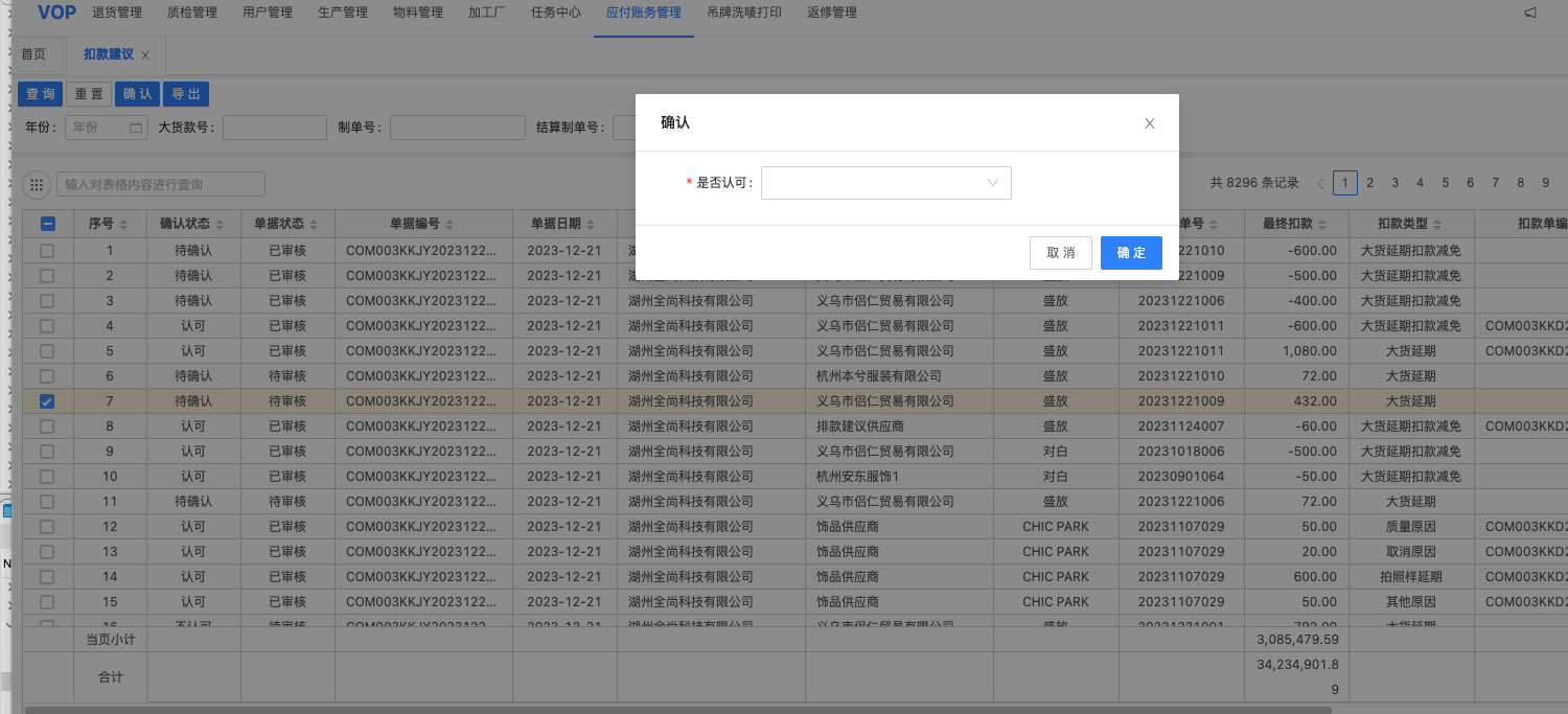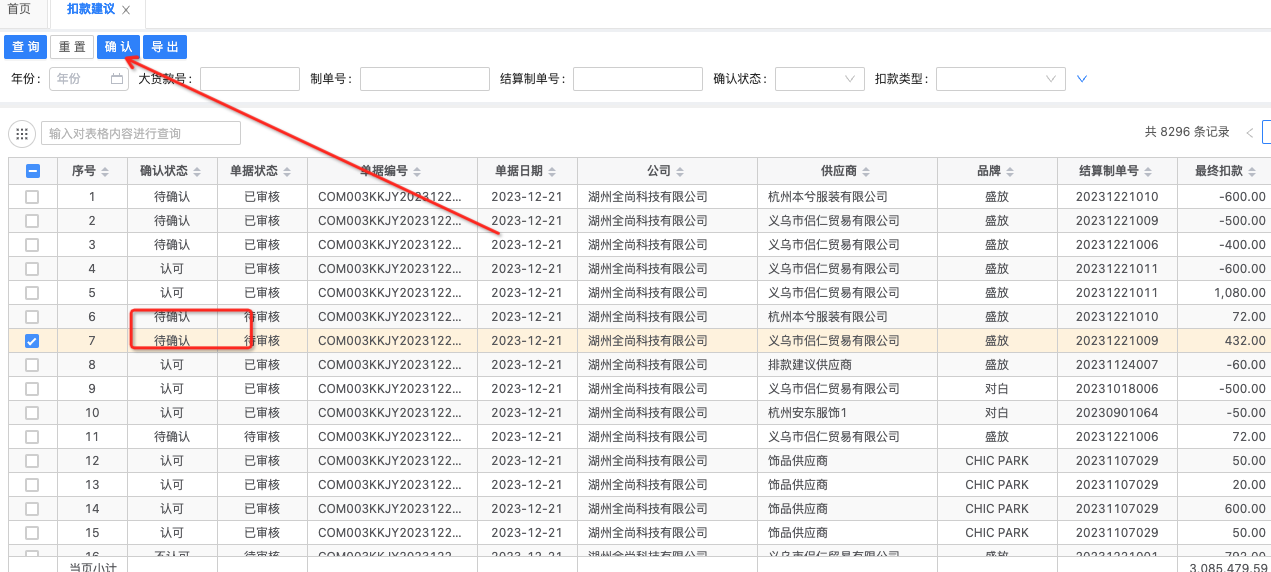 只有待确认状态的扣款建议才可以进行确认。点击确认按钮会有二次弹窗确认。