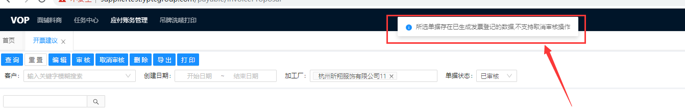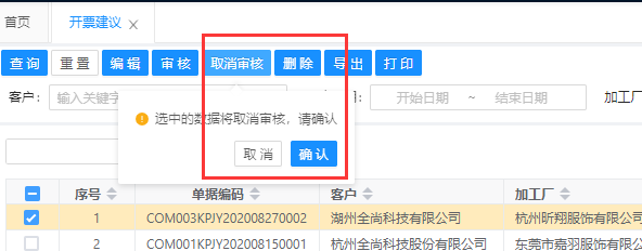 已审核的开票建议支持取消审核,但是如果开票建议被客户的财务拉取生成发票登记的情况下不支持取消审核。如果供应商需要取消审核,请与客户的财务进行确认,让客户的财务将已生成的发票登记进行删除,删除后供应商才能对开票建议取消审核。