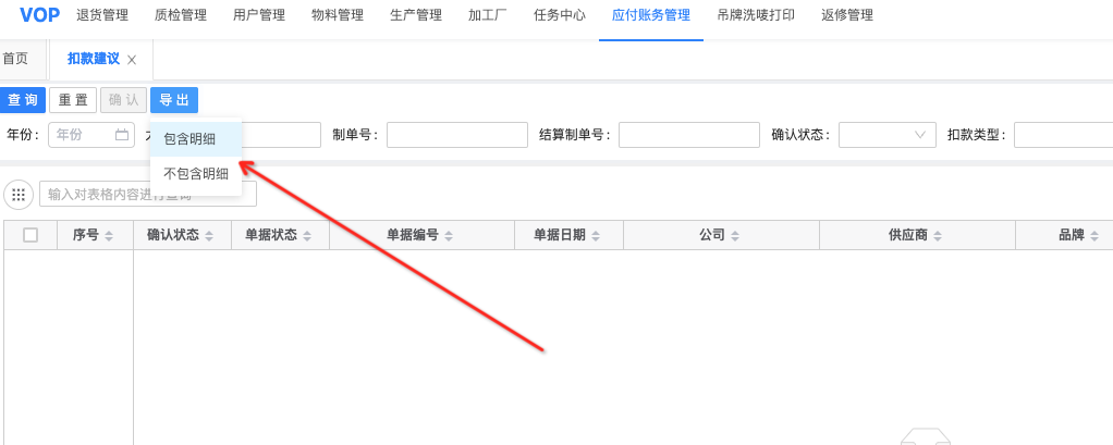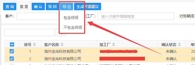 两者的区别在于,包含明细导出的话,会把对应的扣款建议里面的关于制单号的信息给一并导出来,导出的维度也变成了制单号维度。