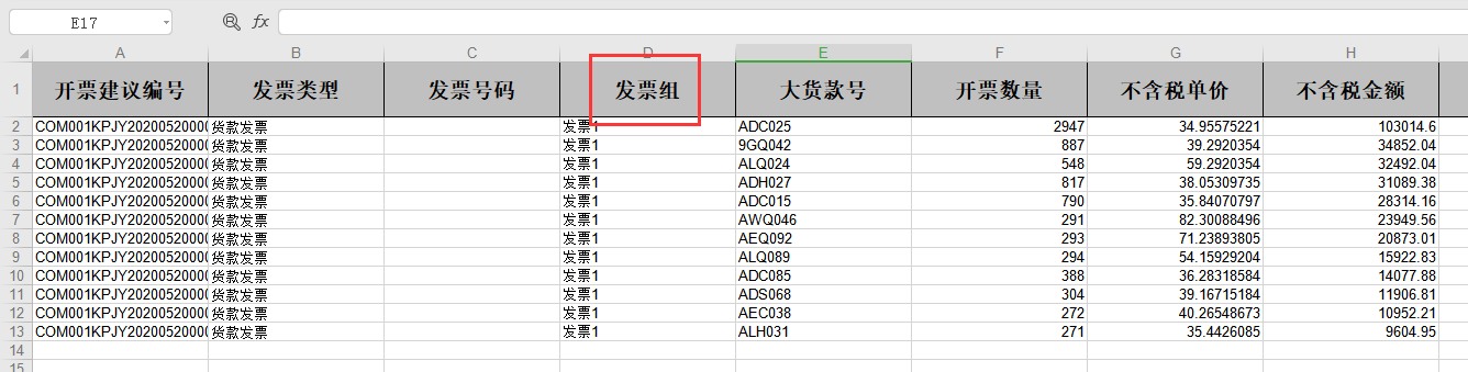财务人员可以根据导出的sheet中的“开票建议单号+发票组”维度来区分开多少张发票,每张发票开什么款号,款号对应的数量及金额。