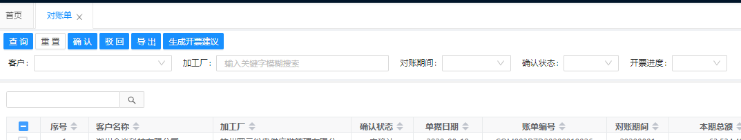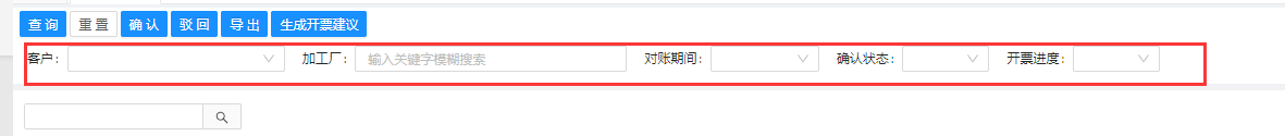 查询、确认、驳回、导出、生成开票建议