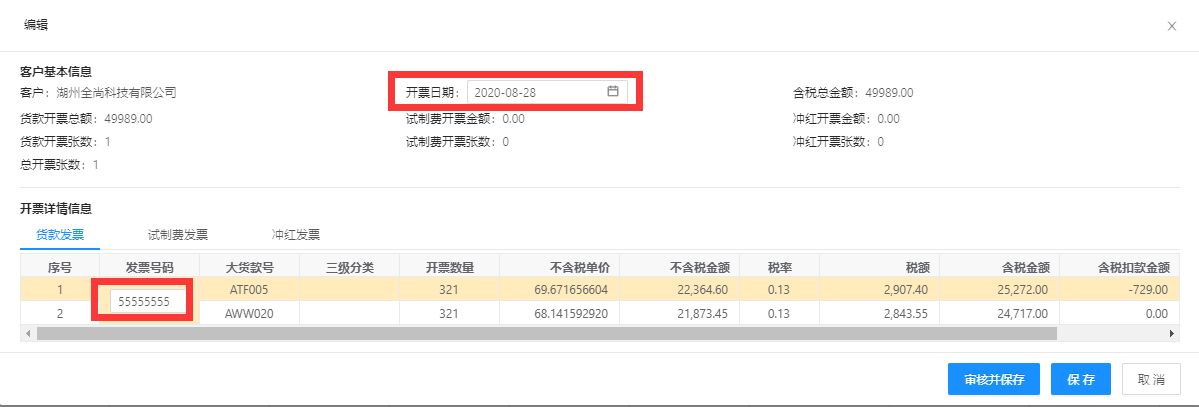 待审核状态的开票建议支持编辑,编辑页面下只能修改开票日期和录入货款发票、试制费发票、冲红发票中对应的发票号,其他字段内容不支持修改。