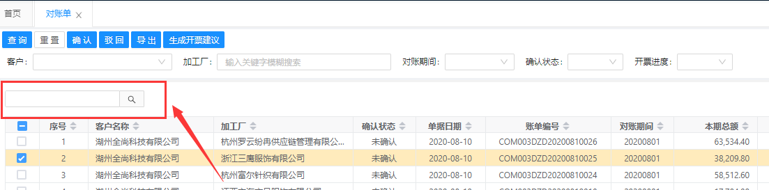 对账单支持客户(衣品天成集团下的公司)、对账期间、确认状态、开票进度的查询条件进行查询。