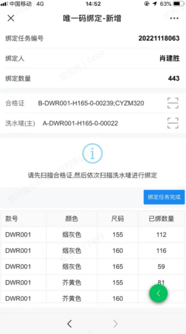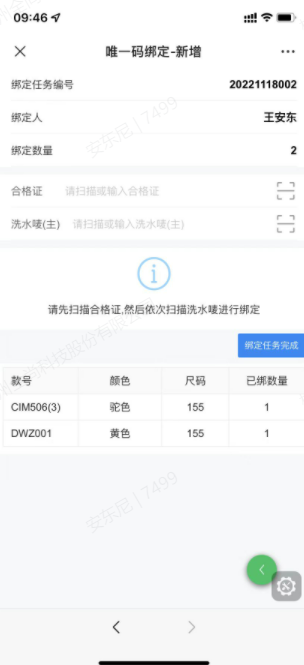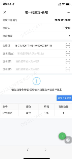 扫描合格证唯一码,扫描洗唛唯一码,扫描后立即绑定成功,并增加已绑定数量