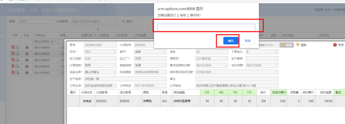 一、菜单:SCM -商品管理 - 大货 - 大货下单管理(首单)二、通过搜索条件:下单状态=提交(待审核),品牌=(自己的品牌),如下图 三、选中其中一条,双击进入明细,点击【审核】按钮 四、弹框:填写审核评语,非必填,点击【确认】按钮,审核完成 注意:1、一定要选择好自己的品牌,不要审核错了采购单,会有记录留下来的哟!2、SCM批量审核功能:开发中,暂时先辛苦大家单个进入审核,查看货期明细。附件SCM首单审核流程V1.0.0_20200105.docx文档更新时间: 2025-01-23 11:20 作者:汪归