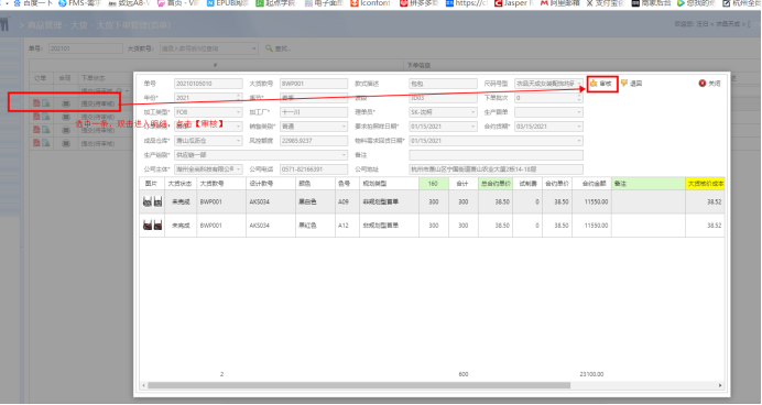 目录 搜索 旺店通(OMS)使用手册1.店铺授权得物2.订单停留在原始订单显示无效货品&平台货品与订单的关系&平台订单明细与实际发货明细不一致3.库存管理:可用库存查询与算法4.SKU出入库记录查询5.旺店通预售功能使用说明6.库存同步7.常用的赠品策略7.1 门店软装系统操作手册7.2 新增赠品SKU8.客服常用功能配置9.常用功能10.常见问题11.库存管理-库存差异查询方法12.给外部运营开通账号通天晓(WMS)使用手册一、快递新增与对接二、电子面单授权申请三、快递修改(OMS、WMS修改)四、后置打印配置(单品分拣打印面单配置))五、常见问题整理六、云打印配置装箱清单模糊问题修复简派(SCM)使用手册饰品货品创建及下首单流程一、大货首单审核步骤二、大货订单反关闭三、改颜色、尺码号型操作自研(FMS)使用手册大货BOM批量新增物料艾造使用手册2021-11-18日迭代功能操作手册影刀RPA群问题搜集①SCM光板-印花-换标-换款问题沟通⑪ 运营相关问题沟通票易通 暂无相关搜索结果! 本文档使用 MinDoc 发布 一、大货首单审核步骤 一、菜单:SCM -商品管理 - 大货 - 大货下单管理(首单)二、通过搜索条件:下单状态=提交(待审核),品牌=(自己的品牌),如下图 三、选中其中一条,双击进入明细,点击【审核】按钮 四、弹框:填写审核评语,非必填,点击【确认】按钮,审核完成 注意:1、一定要选择好自己的品牌,不要审核错了采购单,会有记录留下来的哟!2、SCM批量审核功能:开发中,暂时先辛苦大家单个进入审核,查看货期明细。附件SCM首单审核流程V1.0.0_20200105.docx文档更新时间: 2025-01-23 11:20 作者:汪归