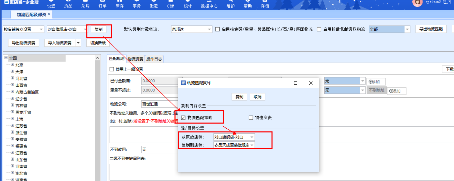 2、其中一个店铺设置好后,选择【复制】,选择【物流匹配策略】,勾选店铺:
