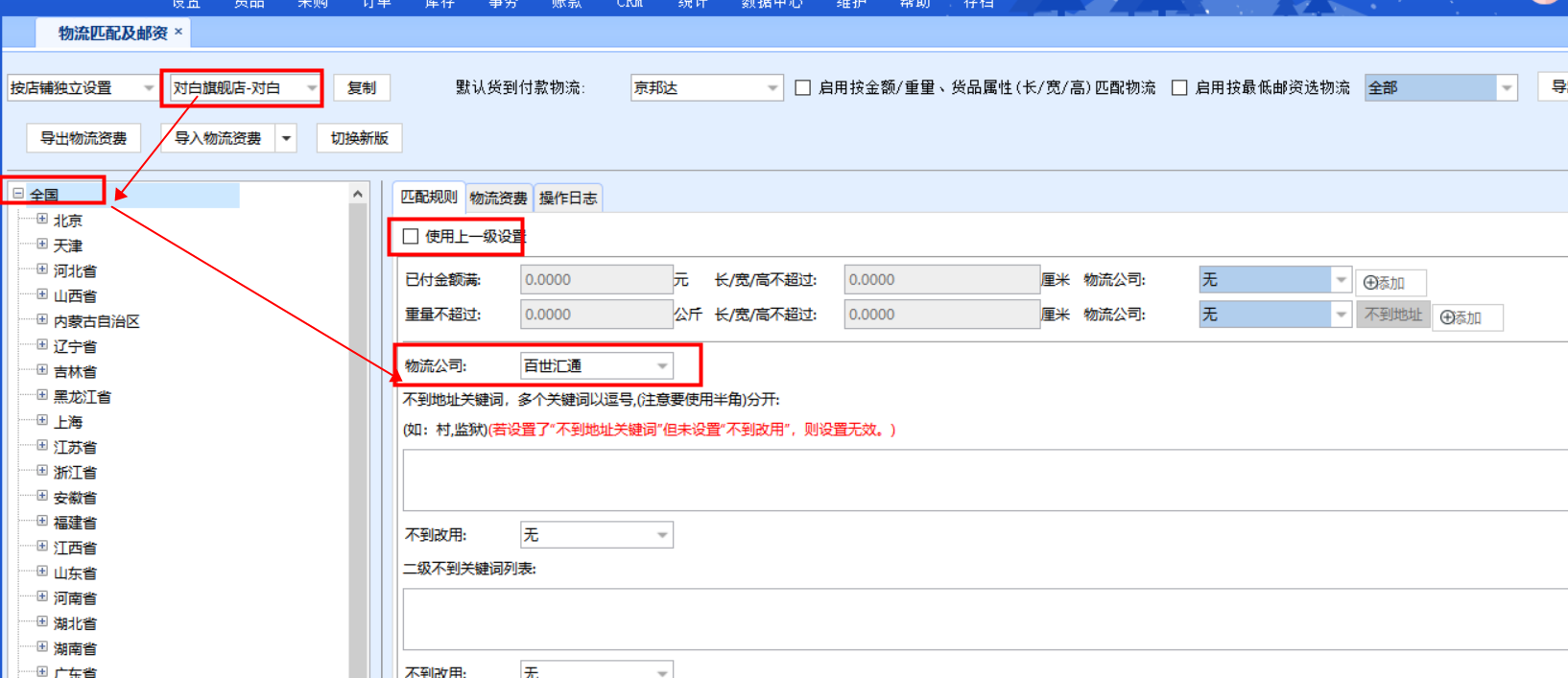 选中全国,修改物流公司,以下省市区选择【使用上一级设置】(默认勾选使用上一级设置)