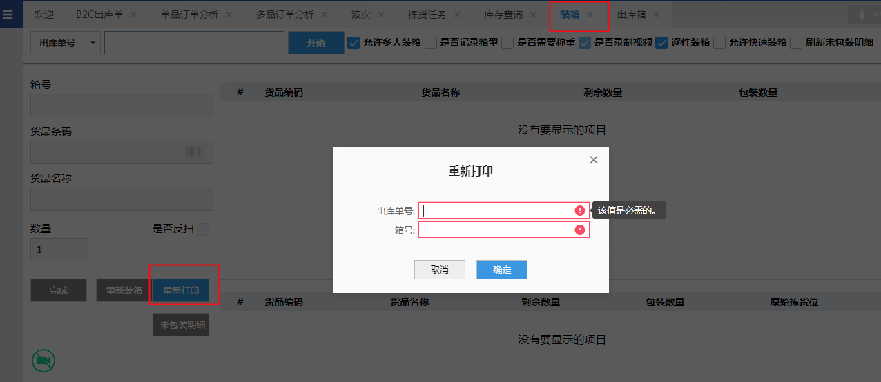最后装箱打印清单,可以补打,同一操作界面,满足门店这外面贴一张,箱子里面放一张;